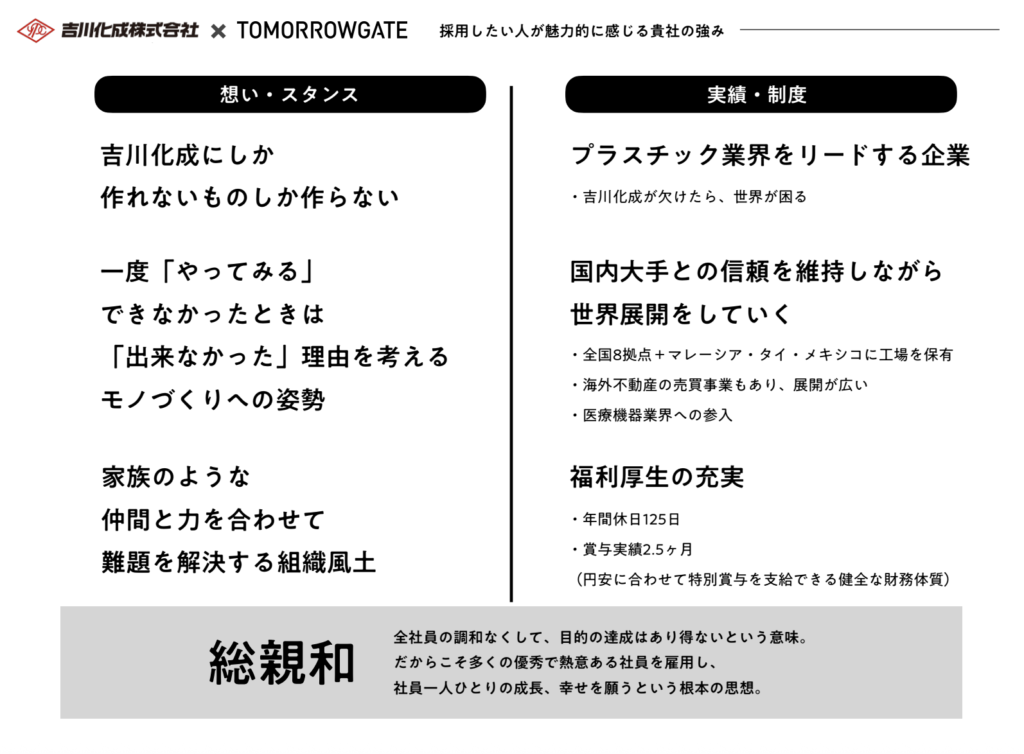 吉川化成が採用したい人に魅力的に感じるであろう強みは、「想い・スタンス」と「実績・制度」のふたつの側面から多角的に提示されると考えられました。