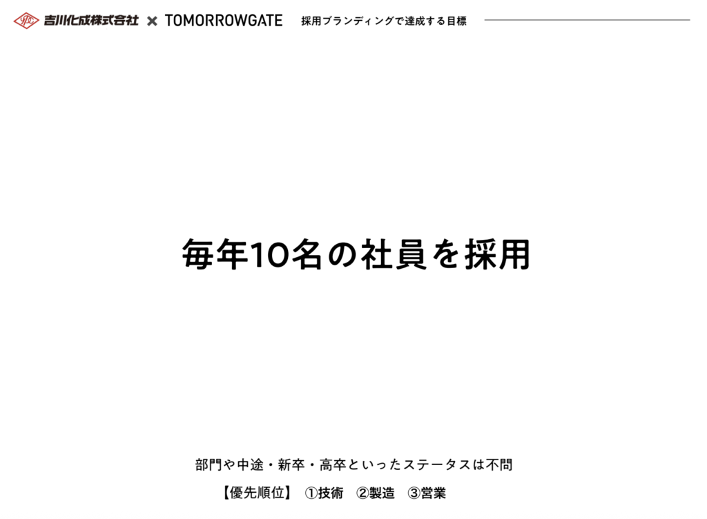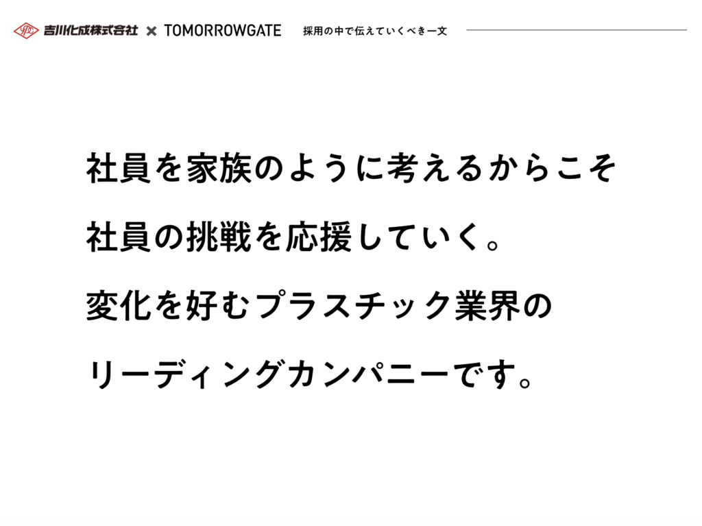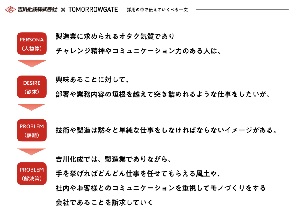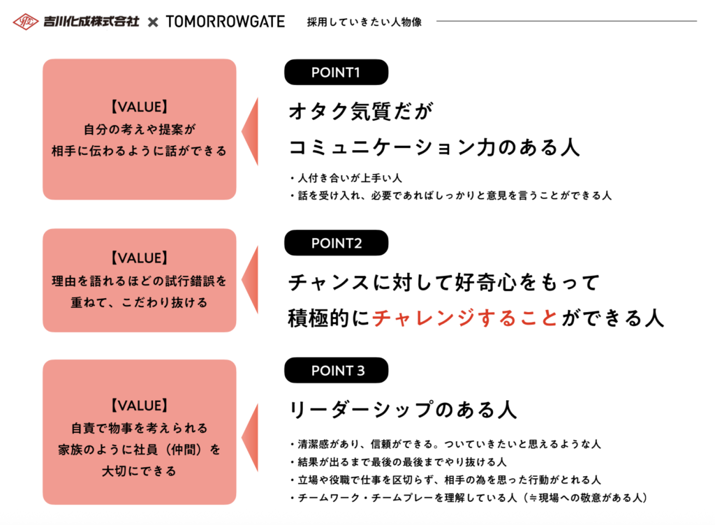 トゥモローゲートはこれら3つのポイントを満たす人が、吉川化成の理念に共感した採用のターゲットとなり得ると定めたのです。