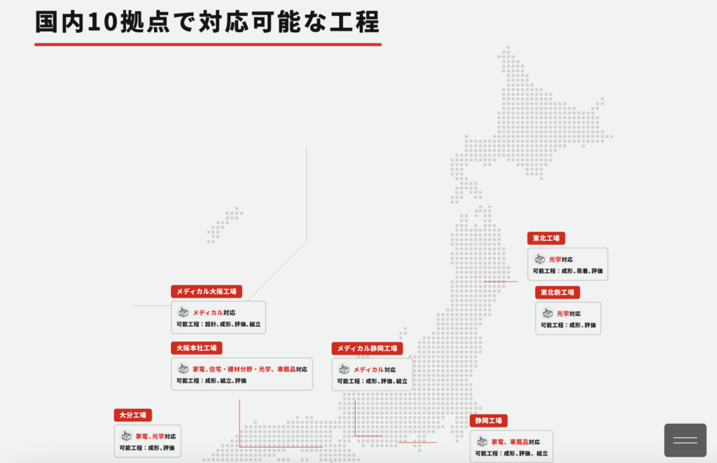 設計から金型づくり、成形、塗装や組立までを自社で一貫して行えるのが強みで、国内では大阪や奈良、静岡、東北、そして大分など計10拠点。国外では、タイやマレーシアなどに計5拠点を展開しています。
