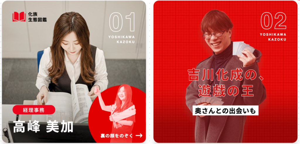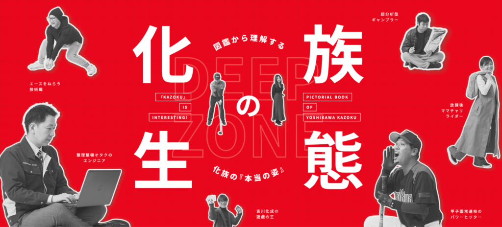 メインビジュアルでは「吉川化族」というコンセプトを打ち出すために、会社全体の温かさや団結力を伝える意図で家族写真のような構造に。