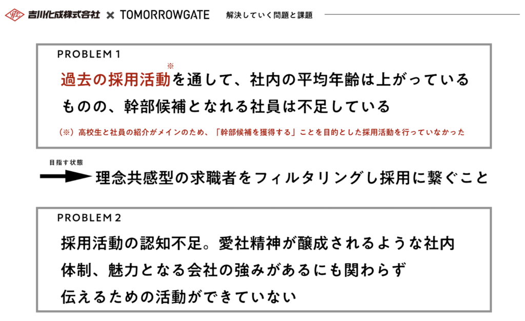 吉川化成が採用ブランディングを通して解決すべき問題と課題は、多くの企業が抱える共通の課題でもありました。私たちトゥモローゲートはそれらの根源に対し、戦略的なアプローチで解決策を2つ提案しました。