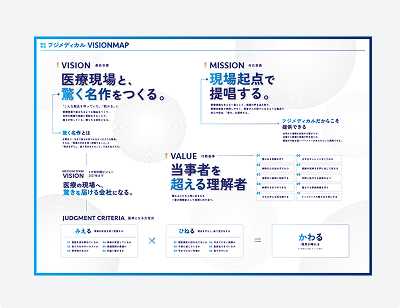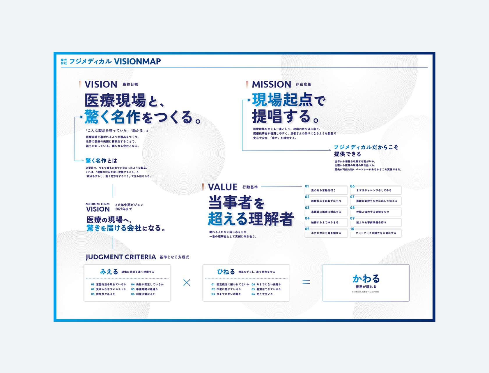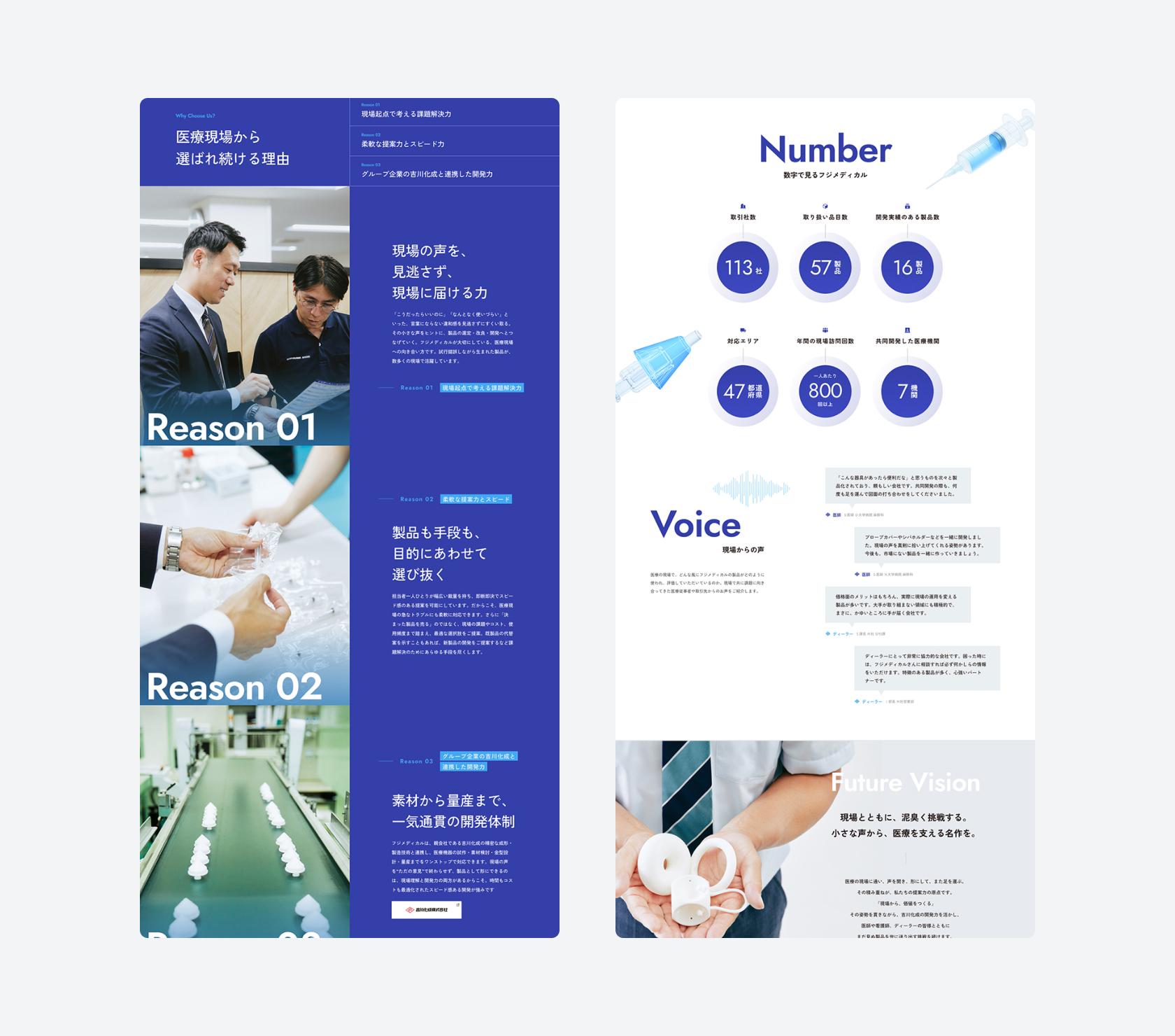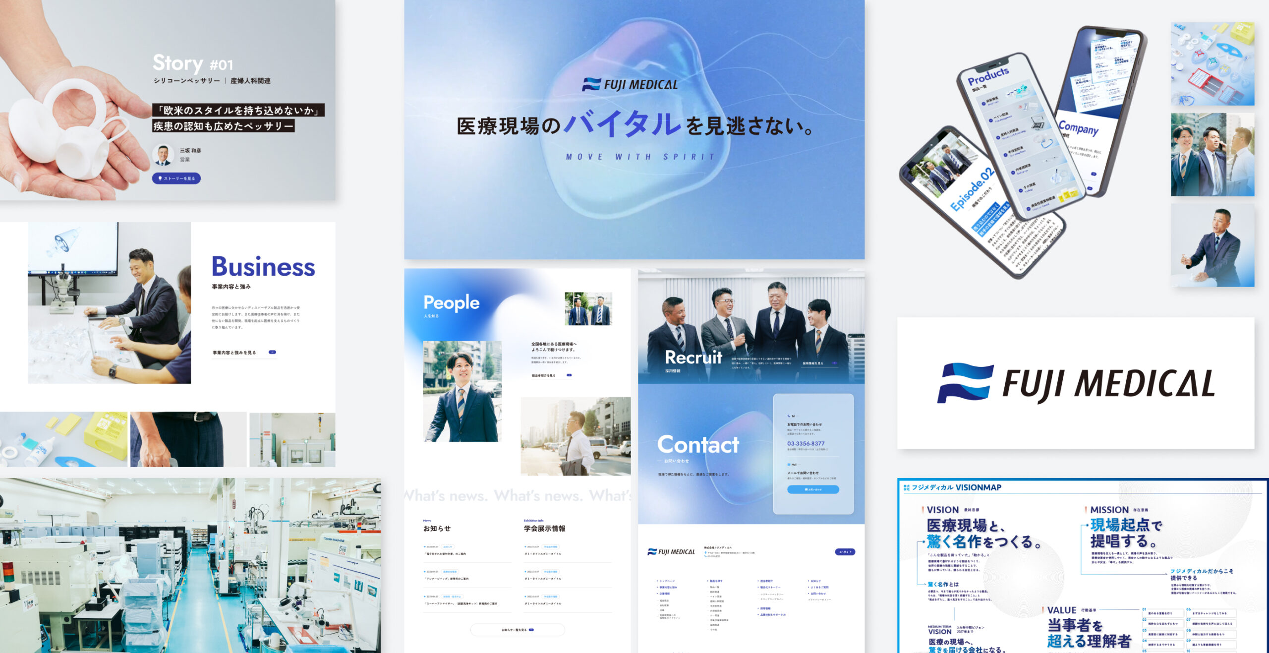 医療のディスポーザブル製品を扱うフジメディカル様。医療現場を起点にした営業と開発、そこに注がれる熱量や想いを、複数の制作物を通して表現しました。吉川化成様の子会社化にあたり経営理念を再定義。「製品そのものが信頼の目印でありたい」という想いを、青を基調とした旗印のロゴに落とし込みました。企業サイトでは、情報の探しやすさに加え、現場の小さな声を見逃さない姿勢や、社員の人間味が伝わるコンテンツを用意しています。