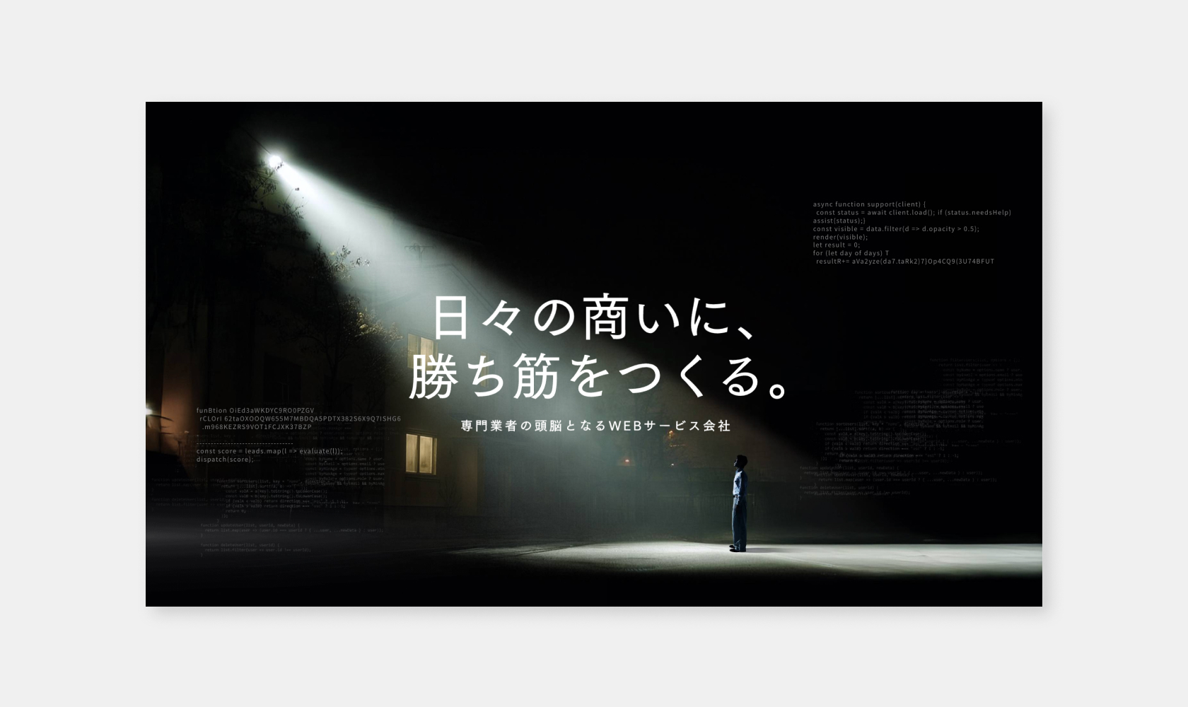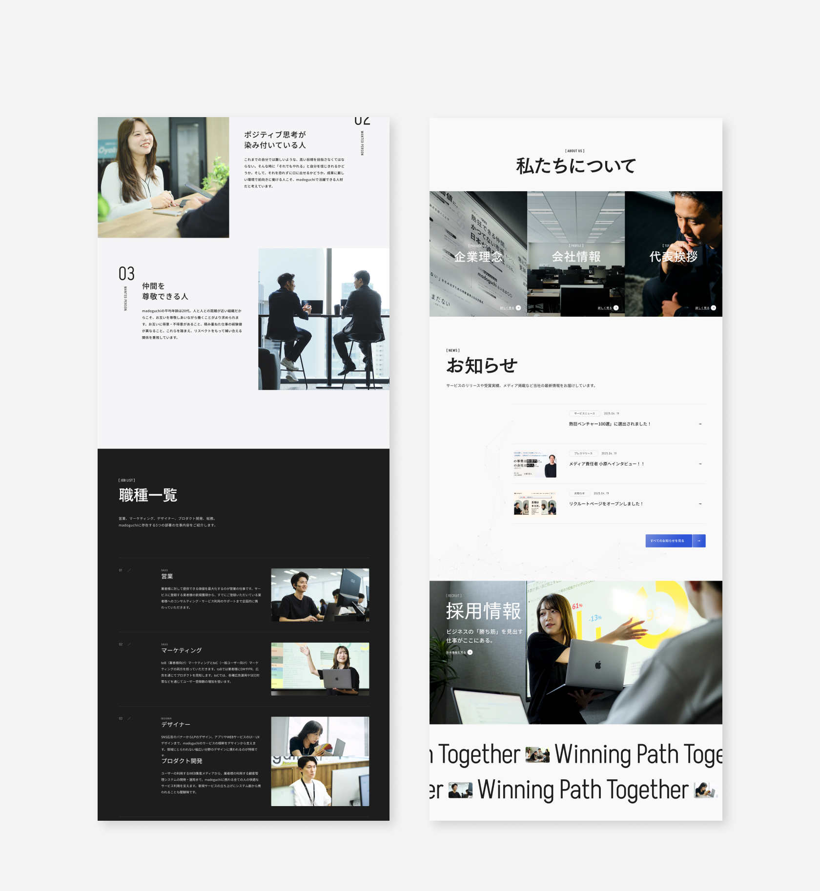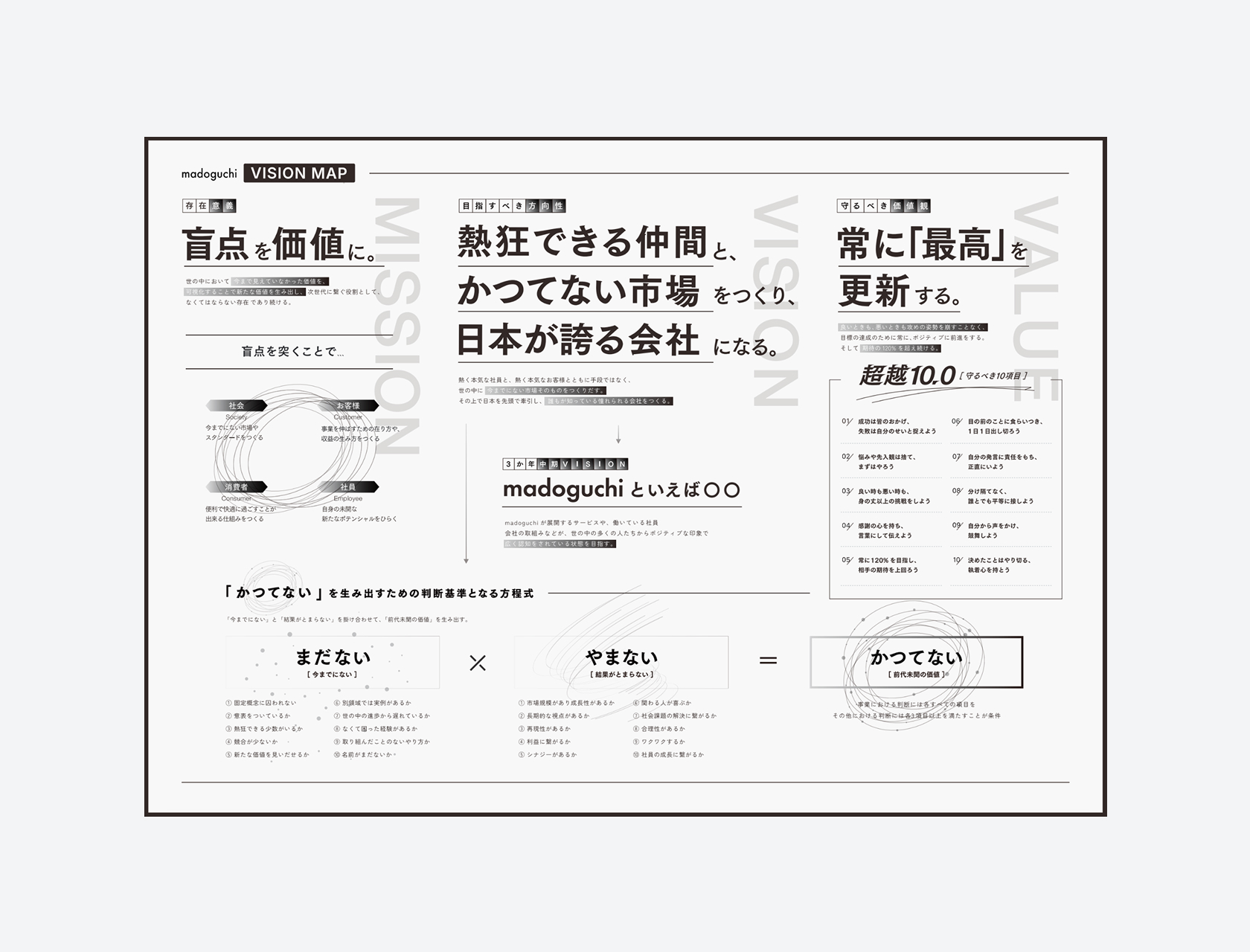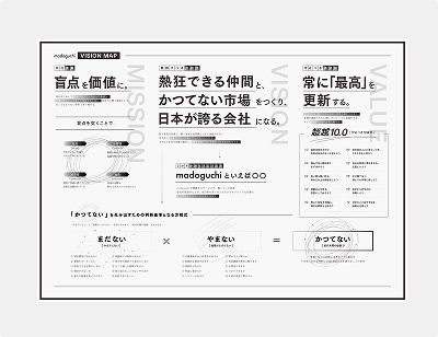 ハウスクリーニングや不用品回収など、暮らしの困りごとを解決する専門業者とユーザーをマッチングさせる業界特化のWEB・アプリを開発するmadoguchi様。単なるWebメディアの運営にとどまらず、再現性のある勝ち筋を見出し続ける真摯な姿勢を、ビジョンマップと企業サイトを通じて表現しました。テクノロジーを象徴するあしらいを随所に取り入れながら、業者様の成果に本気で向き合う熱量と、高い戦略性を伝えるために、撮影構図・レイアウト・アニメーションを工夫しています。