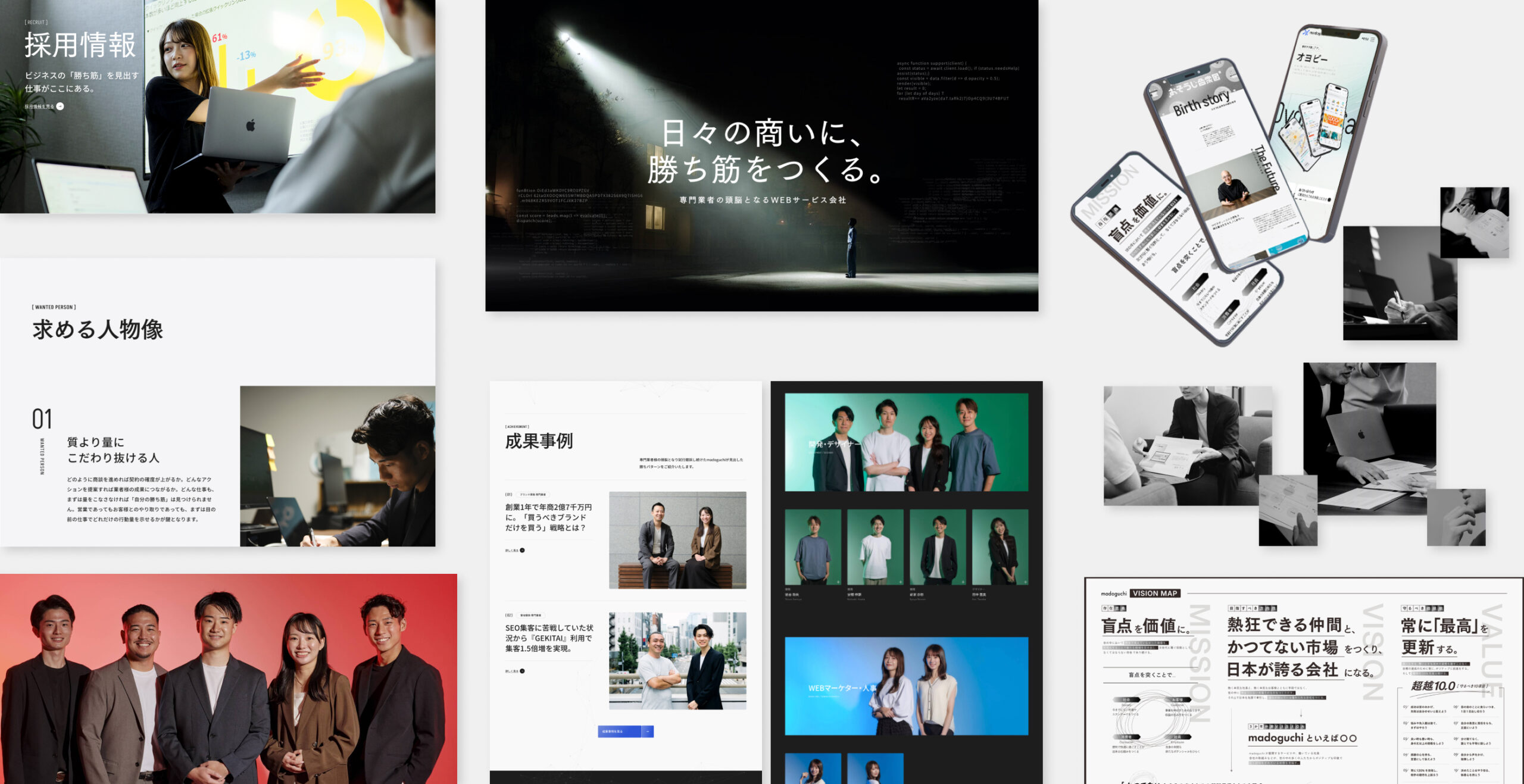 ハウスクリーニングや不用品回収など、暮らしの困りごとを解決する専門業者とユーザーをマッチングさせる業界特化のWEB・アプリを開発するmadoguchi様。単なるWebメディアの運営にとどまらず、再現性のある勝ち筋を見出し続ける真摯な姿勢を、ビジョンマップと企業サイトを通じて表現しました。テクノロジーを象徴するあしらいを随所に取り入れながら、業者様の成果に本気で向き合う熱量と、高い戦略性を伝えるために、撮影構図・レイアウト・アニメーションを工夫しています。