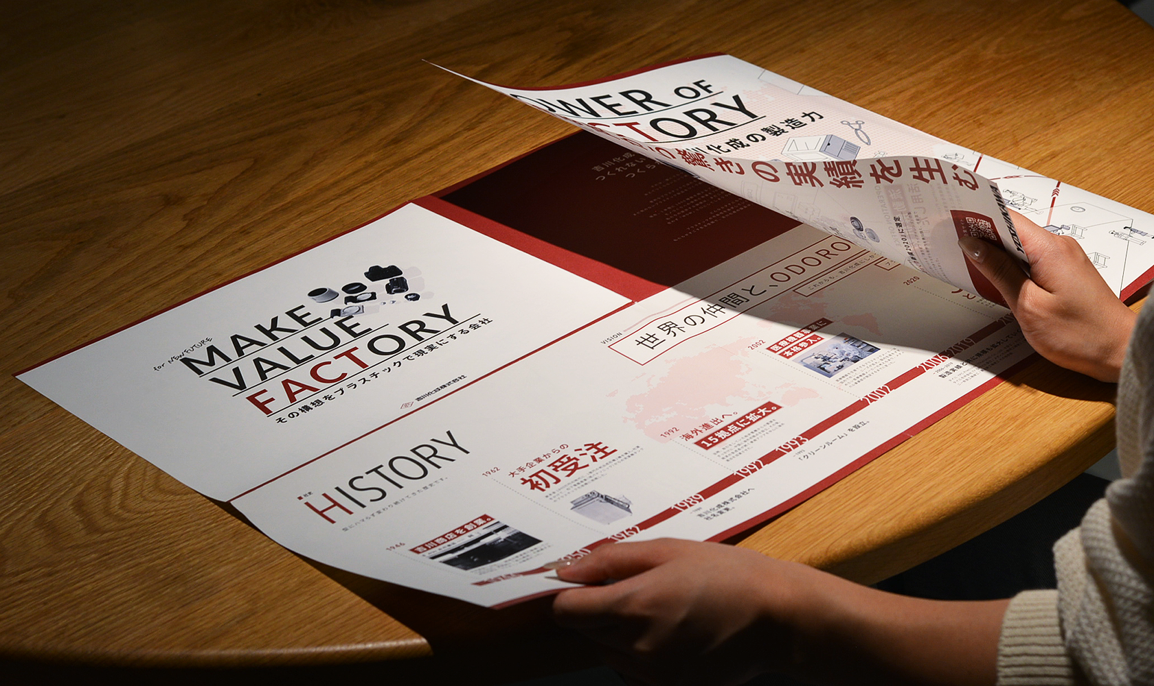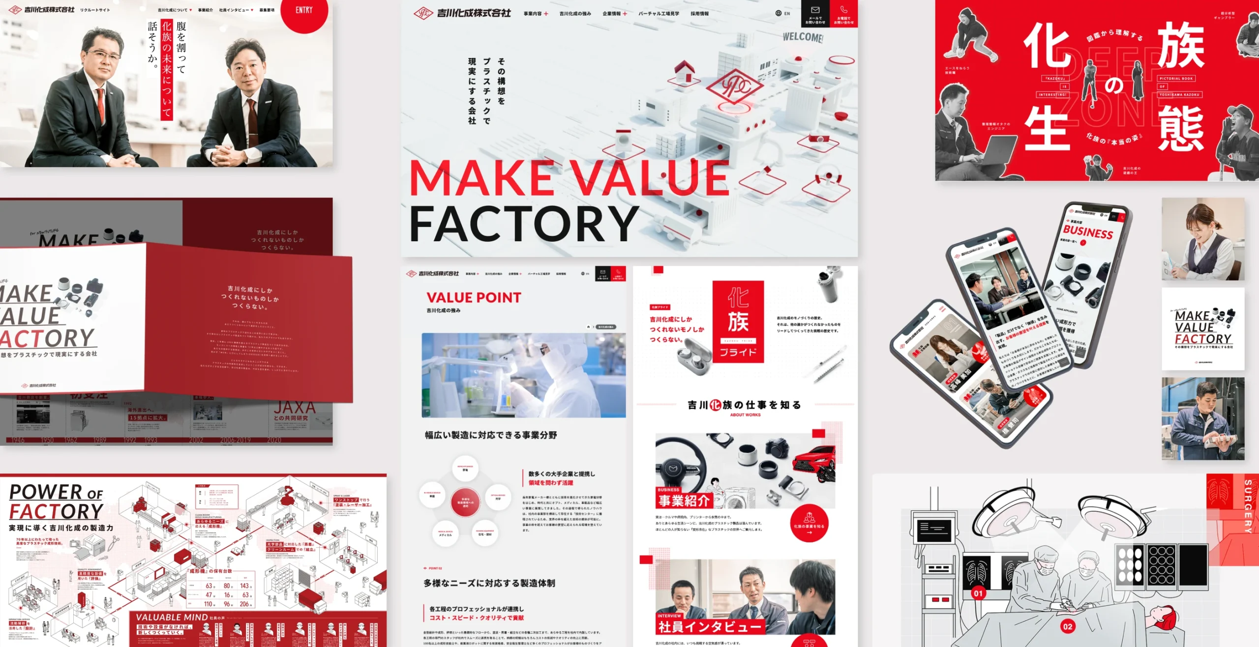 「世界の仲間とODOROKIを」をビジョンに掲げ、世界中で価値創造を続ける老舗のプラスチックメーカー。70年以上かけて積み重ねてきた歴史と伝統。「吉川化成にしかつくれない」ものをつくり続ける独自性。社員を大切にする社風など。数多の魅力を融合させたデザインで、ビジョンマップ、企業・採用サイト、採用動画など、全方面に向けたクリエイティブツールを作成しました。企業サイトではそのスケール感や実績を知ってもらうための「バーチャル工場見学」を企画。採用動画では、ものづくりに欠ける想いや技術力の高さを間接的に訴求すべく、4分間一発撮り、NGは許されない動画を撮影しました。