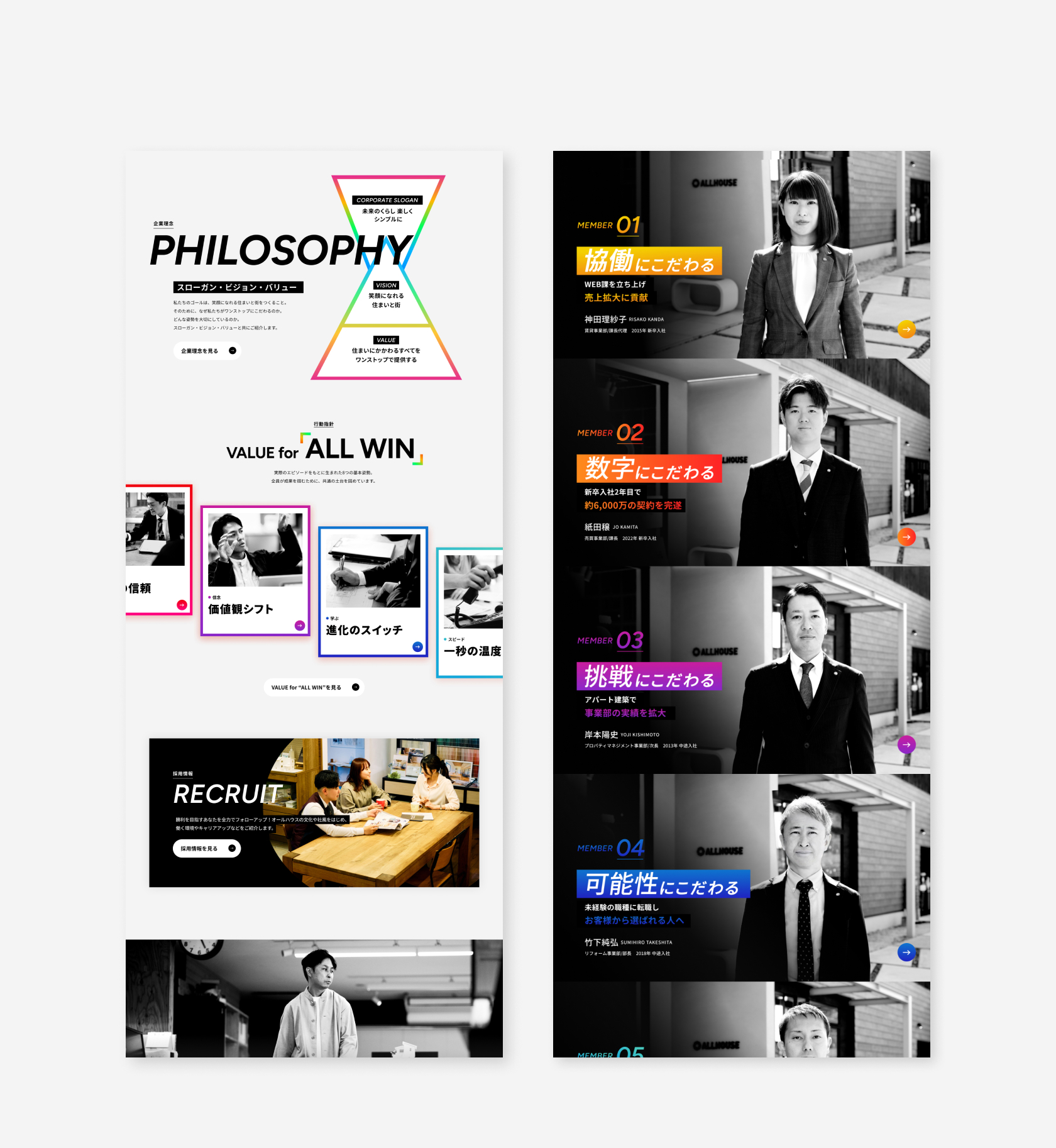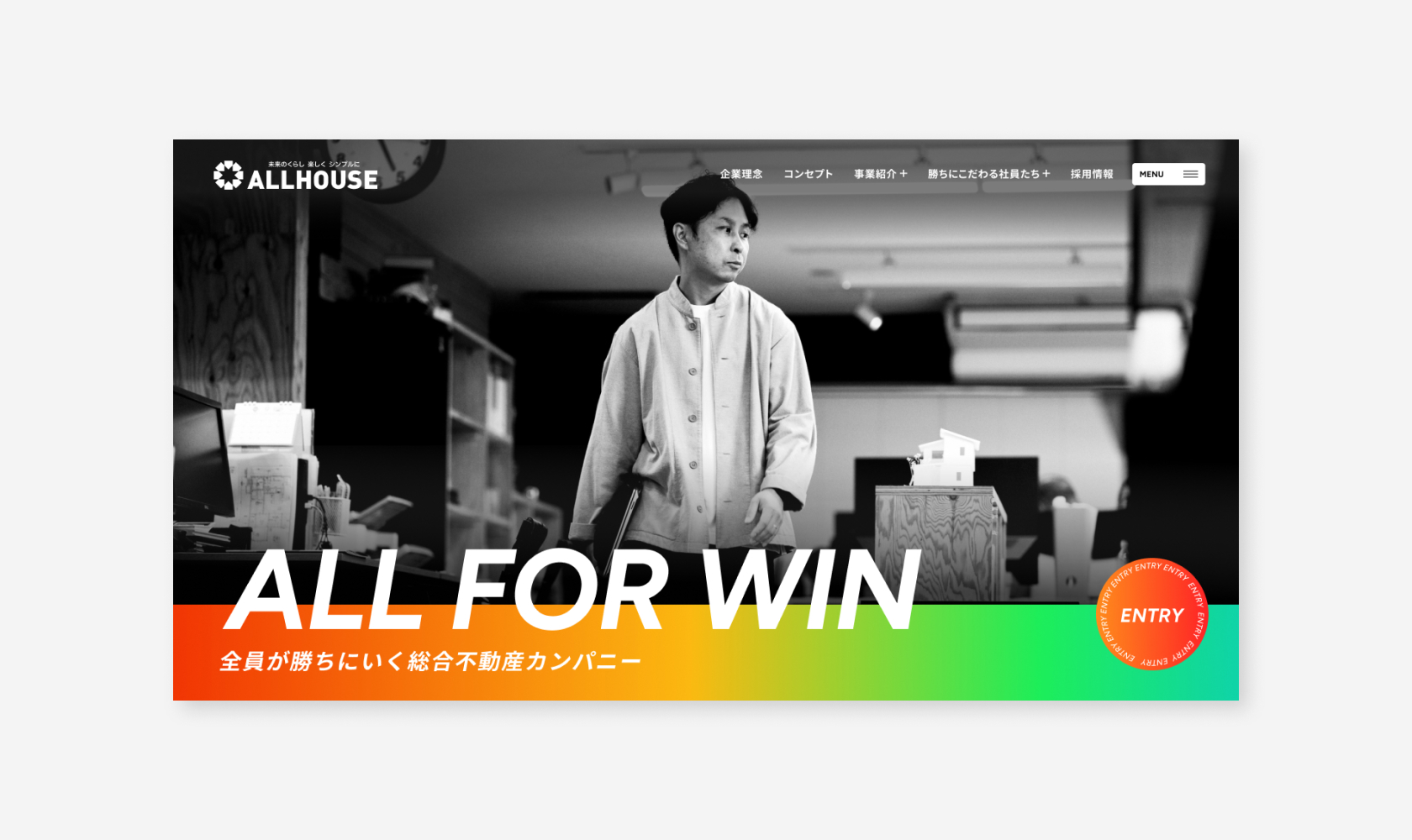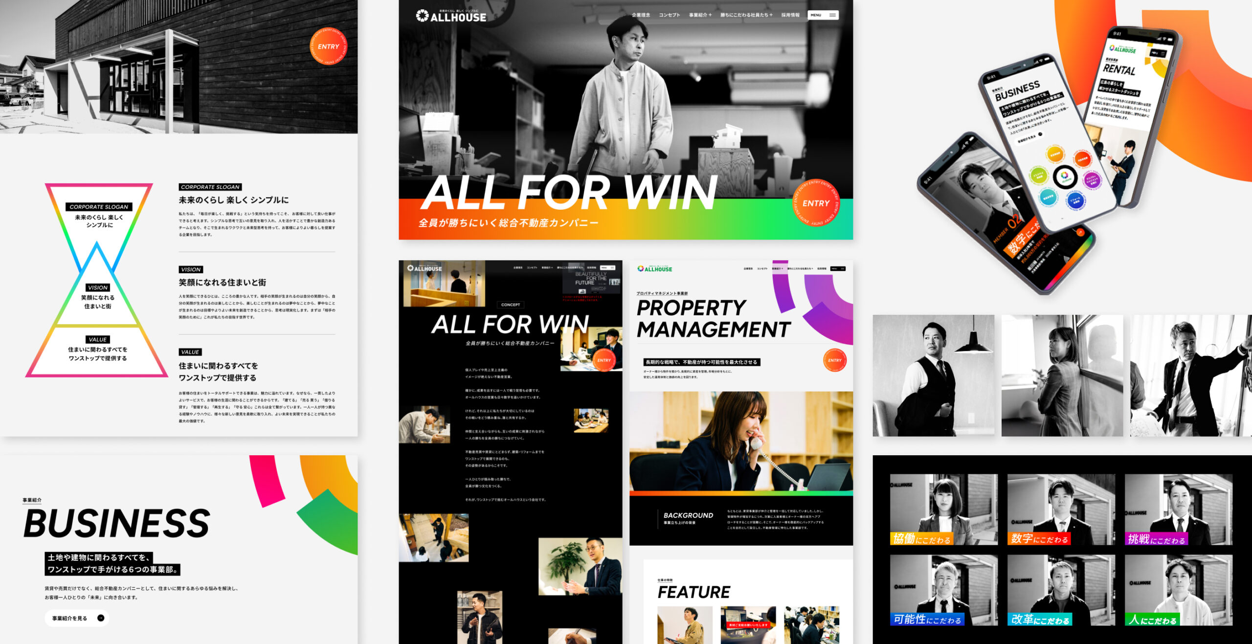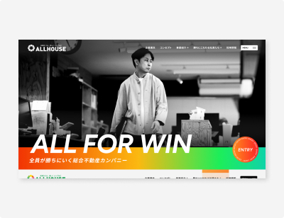 広島で50年以上続く不動産会社「オールハウス」さんの採用サイトを作りました。不動産のお仕事は、「一人ひとりが数字を追いかける」というイメージを持たれることがよくあります。ですが、オールハウスさんが大切にしているのは、仲間と一緒に、切磋琢磨しながら全員が結果を残すことです。そこで「ALL FOR WIN」というコンセプトをつくりました。家を貸す・売る・管理する・リフォームする・建てるなど、様々な仕事を一つの会社で行っていることを伝えています。
