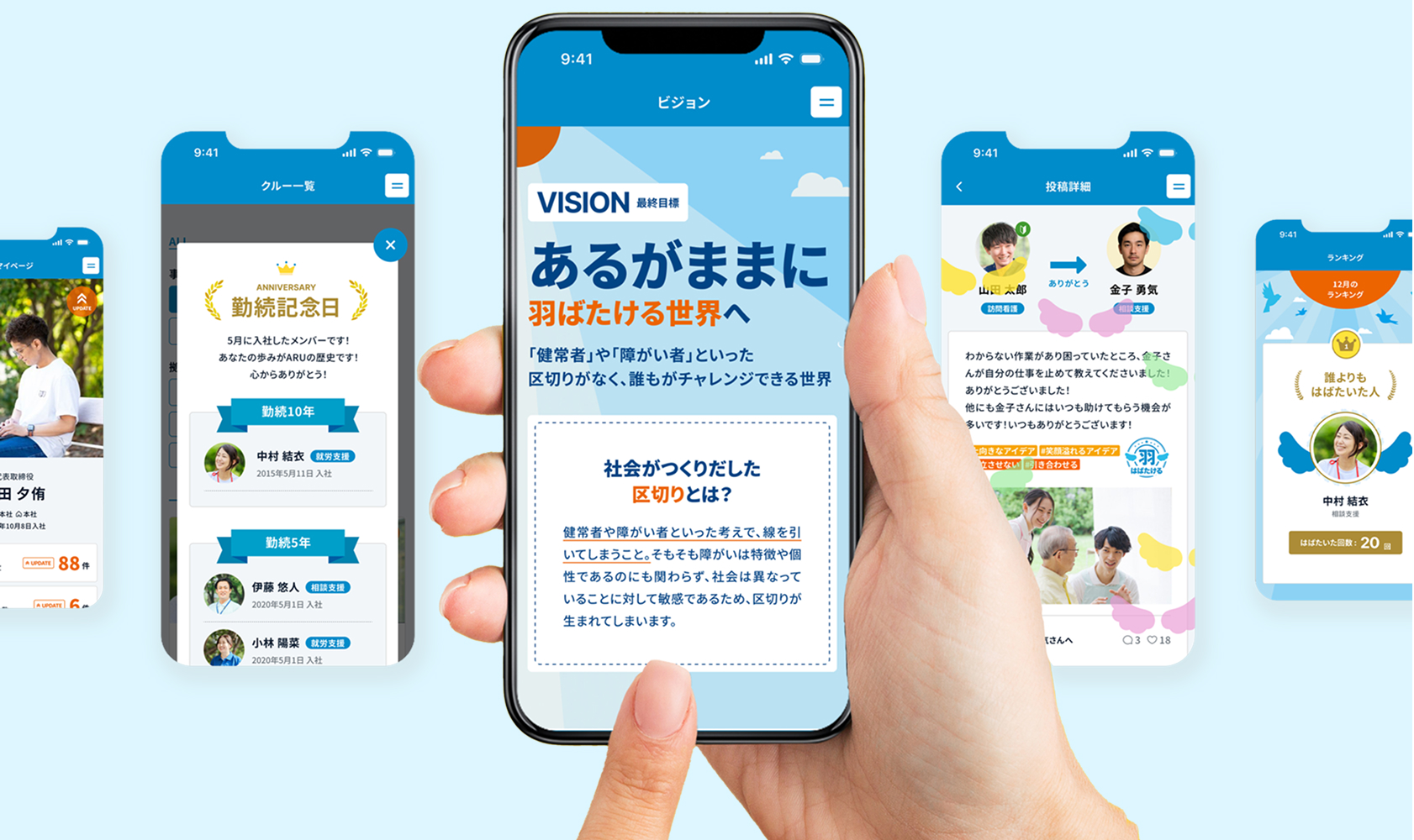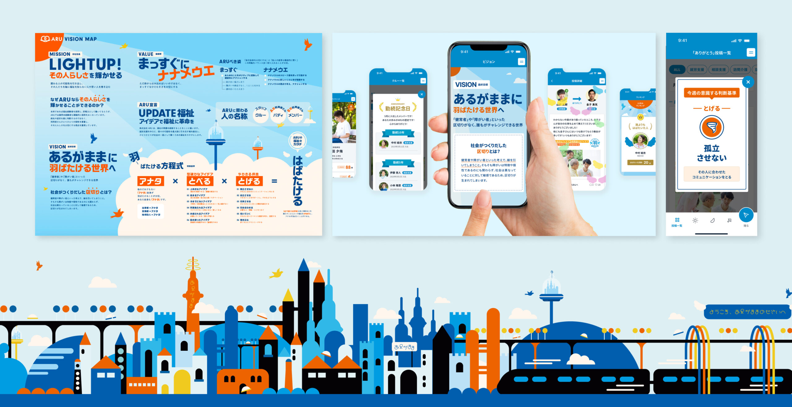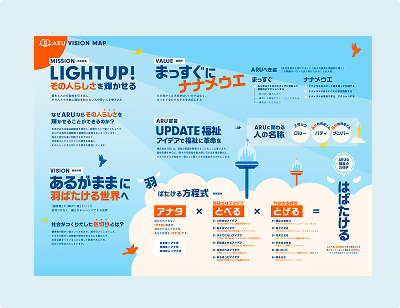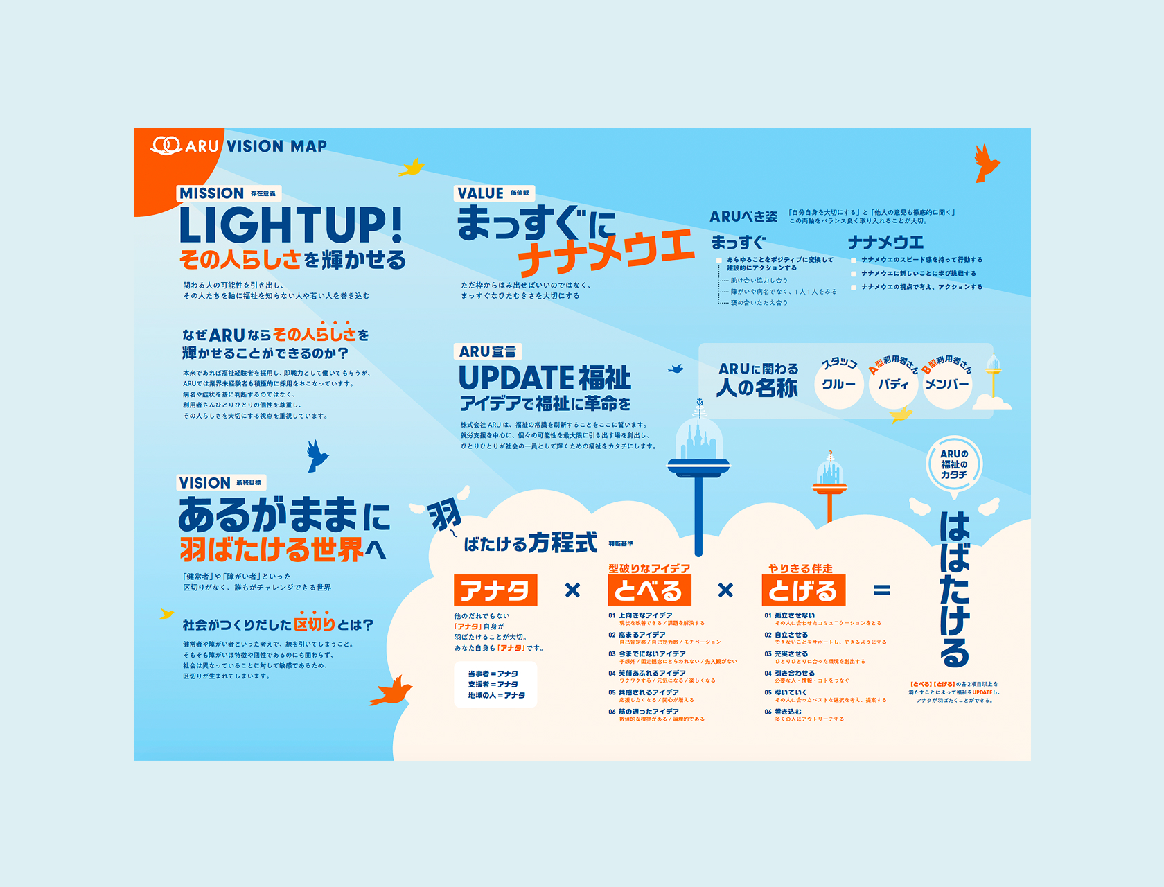 株式会社ARU様は、障がいや病名だけで「できない」と決めつけず、一人ひとりのよさを大切にしている会社です。仲間を支える人たちが同じ気持ちで向き合えるように、大事にしたい考え方を言葉にまとめ、ビジョンマップをつくりました。その人らしさをそのまま受け止めながら、合った仕事をいっしょに見つけていく。そんなARU様のやさしさと強さが伝わる形にしています。