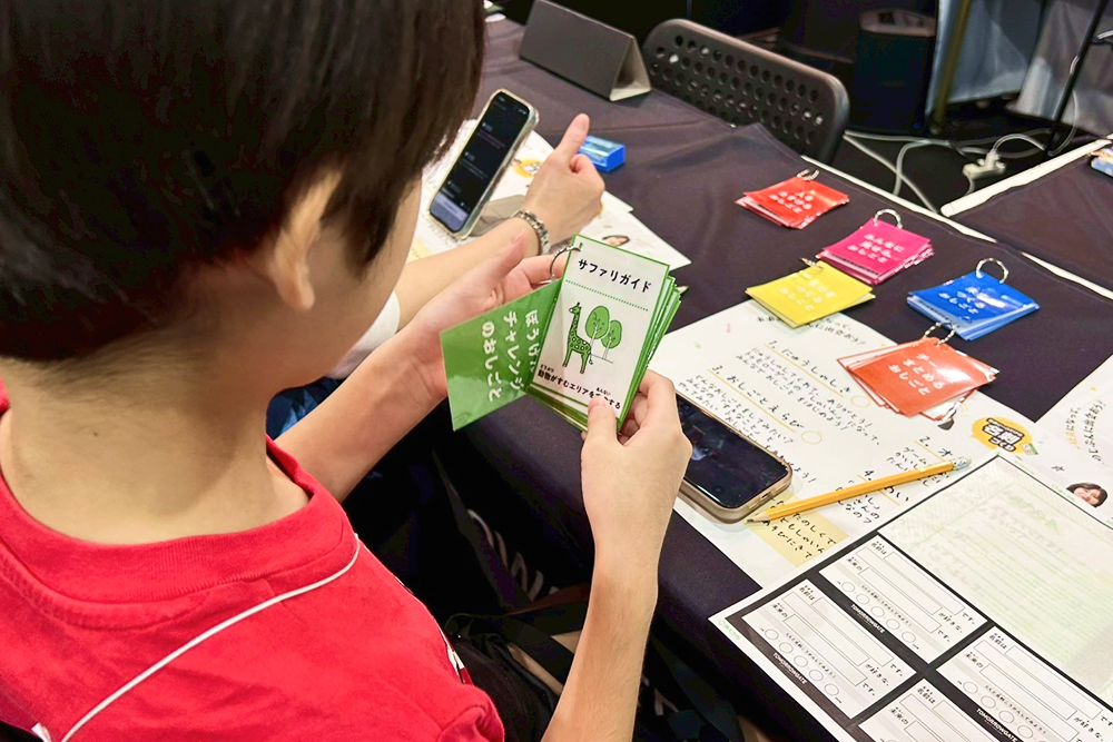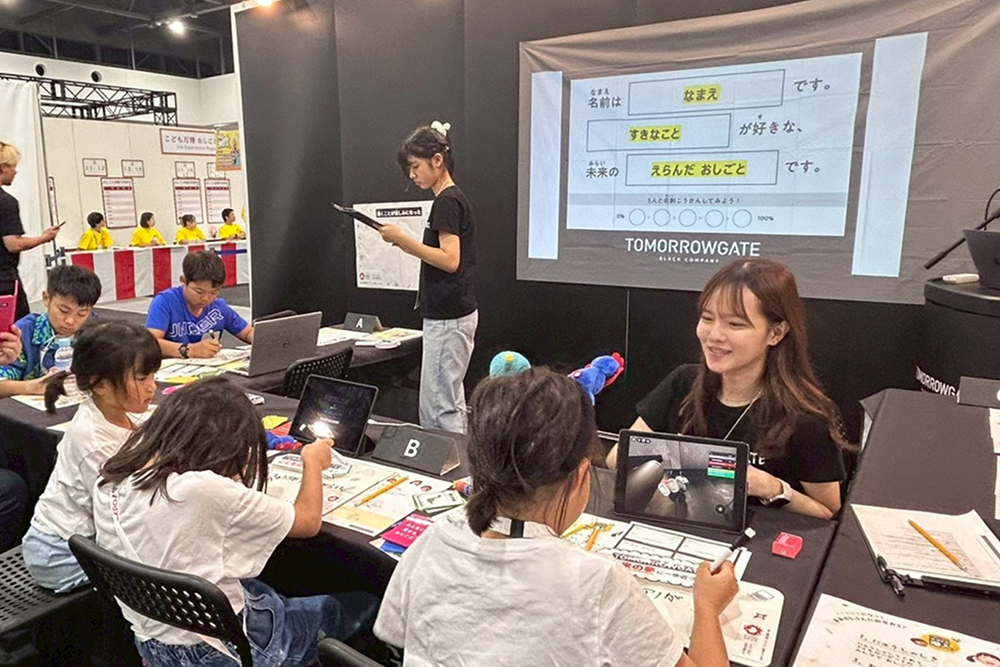 当社ブースでは、子どもたちが仮想空間のオフィスを探検し、自分の“なりたい姿”を名刺にデザインする30分間の没入型ワークショップを開催。さらに、トゥモローゲートの「キッズビジネススクール」受講生が“先生役”として運営をサポートし、自ら学んだ「仕事の楽しさ」を小さな子どもたちへ伝えました。