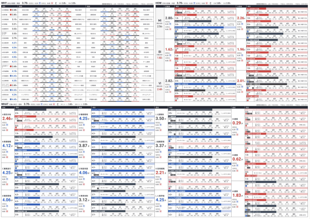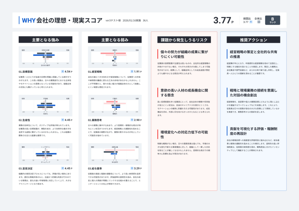 サーベイ結果をもとに、「どの項目が強みで、どこに課題があるのか」を瞬時に抽出。「社員エンゲージメントは高い一方で、メディア発信力に課題がある」など、組織の今の姿を具体的に示します。