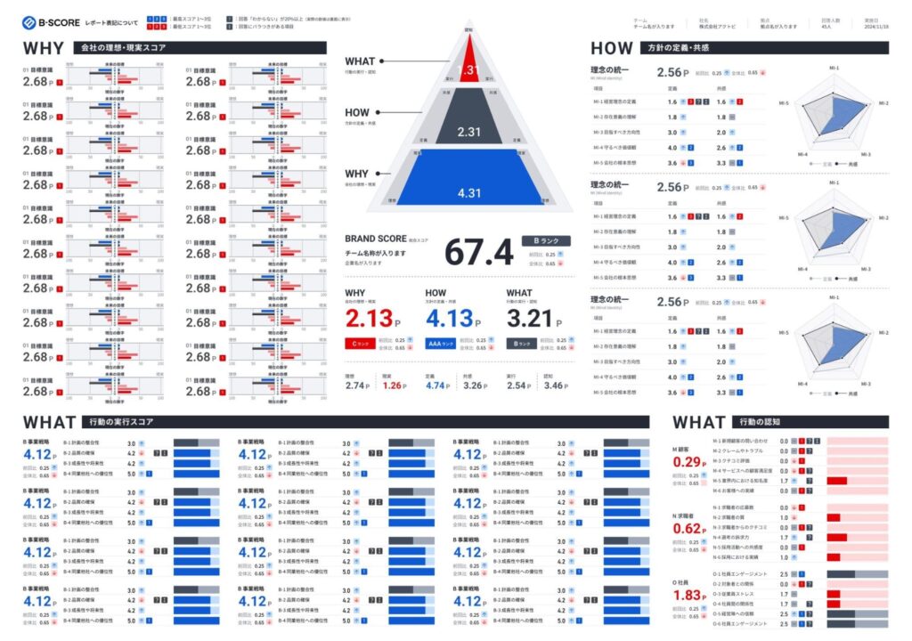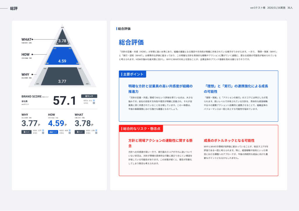 本機能では、弊社がこれまでのブランディング支援の中で培ってきたコンサルタントの分析視点を、AIで自動生成できるよう構造化。分析や整理はAIが担い、判断や意思決定は人が行うという役割分担のもと、サーベイ結果から組織の傾向、課題、将来的なリスク、改善アクションまでを一貫して言語化します。これによりB-SCOREは、サーベイで起こりがちな「測っただけ」で終わらせず、企業自身が「ブランド力を上げていくための改善を回し続けられる状態」をつくるサービスへと進化します。